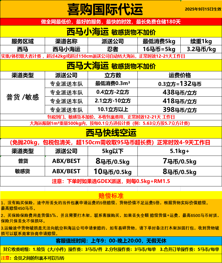 * 默认体积重与实重比较,取较重者计算运费,免抛/半抛优惠请参考报价说明。